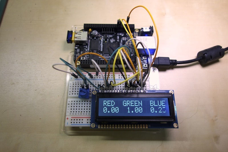 Note that the example assumes an RGB character LCD is attached to the plate, however it will still run with a monochrome LCD (you just might see the backlight turn on and off in different ways as colors as displayed).