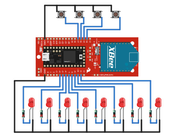 • Checks for received data from the XBee. If a number 1-8 is received, the associated LED on pins 14-21 is illuminated. If any other character is received, all 8 LEDs are are switched off.