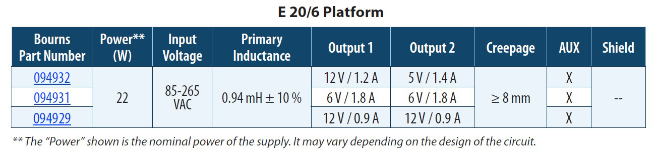 Bourns' SmartPower safety 3 W to 22 W flyback transformers can transfer up to 22 W and are optimized for a working frequency of 132 kHz. The transformer offers two outputs with reinforced insulation for individual operation, parallel, or in-series connection, and includes one bias winding for controller feedback.