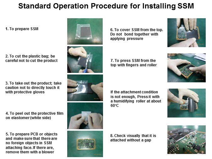 Shown here is the recommended procedure of how to install SSM, the elastomer pad with PGS adhered to it. In preparing the SSM, usually packaged in a plastic pouch, the first steps are to carefully remove it from the pouch and to expose the elastomer side so that the protective film can be peeled off. With a clean PCB prepared (one that is free of foreign objects), apply the SSM solution to the target area of the PCB (the area where the heat is being diffused from). In standard applications, the applicant will use one's fingers to press the SSM material down over the components in the target area. For a more uniform application, it may be necessary to use a roller with heat. Ensure that the SSM material is completely pressed to the PCB. An ideal application will remove as many air gaps as possible, which reduces thermal resistance and increases the overall performance.
